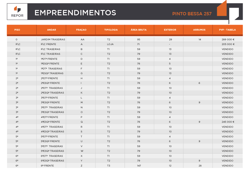 Empreendimento localizado na Rua Pinto Bessa, 257, composto por 26 apartamentos distribuídos por 7 pisos, com tipologias T1, T2 e T3 de áreas generosas, dispondo ainda de um espaço comercial ao nível da rua, 7 lugares de garagem, logradouro, arrumos e sala de condomínio.